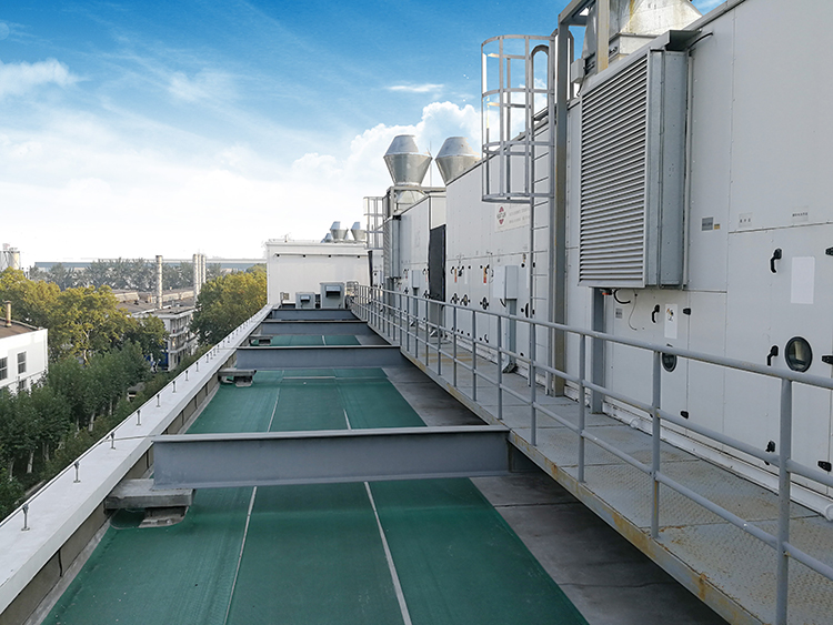 本项目采用8台组合式通风空调机组,其中:2台空调油雾净化机组风量为100000m3/h,单台机组制冷量550kW ,加热量700kW, 6台空调油雾净化机组风量为80000m3/h,单台机组制冷量440kW ,加热量550kW。