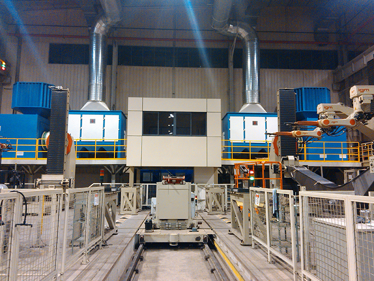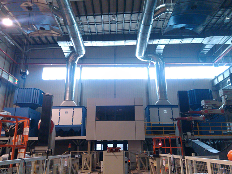 此项目为机器人焊接除尘,区域内分布6台动臂焊接机器人,每台机器人焊接空间在L=5m,W=2m,H=2m范围,起焊在2.5米以上高度。结合客户需求,在满足采光的条件下做透明幕墙,且避免对现场设备作业的干扰,采用半密闭的焊接除尘工作间进行治理,同时在行车顶部对应每个机器人焊接位置,做吸尘罩,不影响工件吊装。下部利用3米高物流通道自然进风,不影响人员进出及小件移动。2套净化设备放置在焊接区域一端主控台左右,底部做钢平台,同主控台底高一致,经净化后空气,室内排放。经业主采集数据证明,采用此方法除尘效率,是局部捕捉方式的20倍。